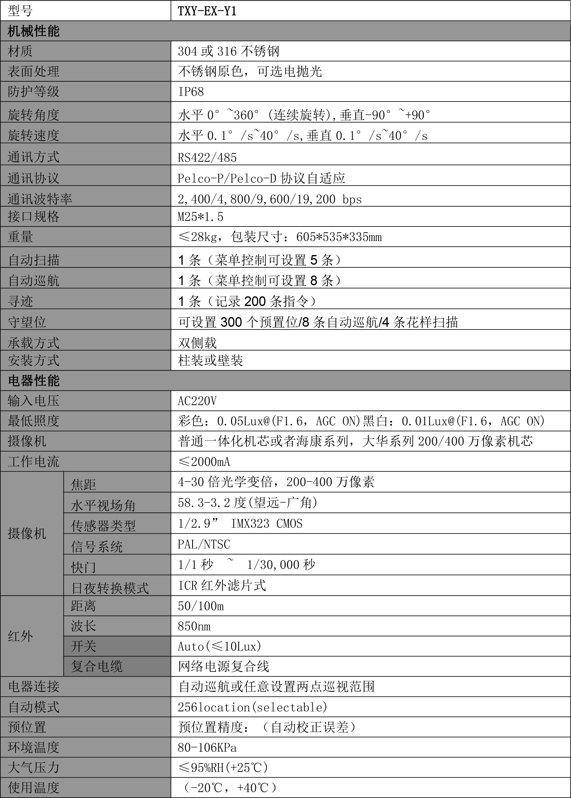 綜上所述,TXY-EX-Y1攝像機以其高度防爆性能、高清畫質、智能功能以及廣泛的應用領域等特點,成為了潛在爆炸性環境中不可或缺的監控設備。它為各行業的安全監控提供了可靠的解決方案,有效保障了人員和財產的安全。